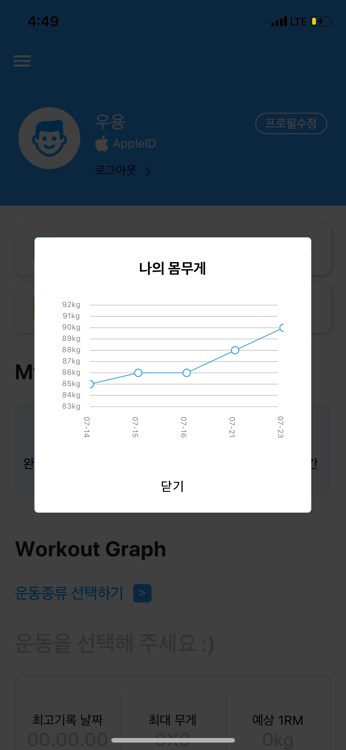 마이페이지에 내 몸무게 변화를 확인할 수 있습니다. 2일 이상 몸무게를 입력하면 몸무게 변화 그래프를 볼 수 있습니다.