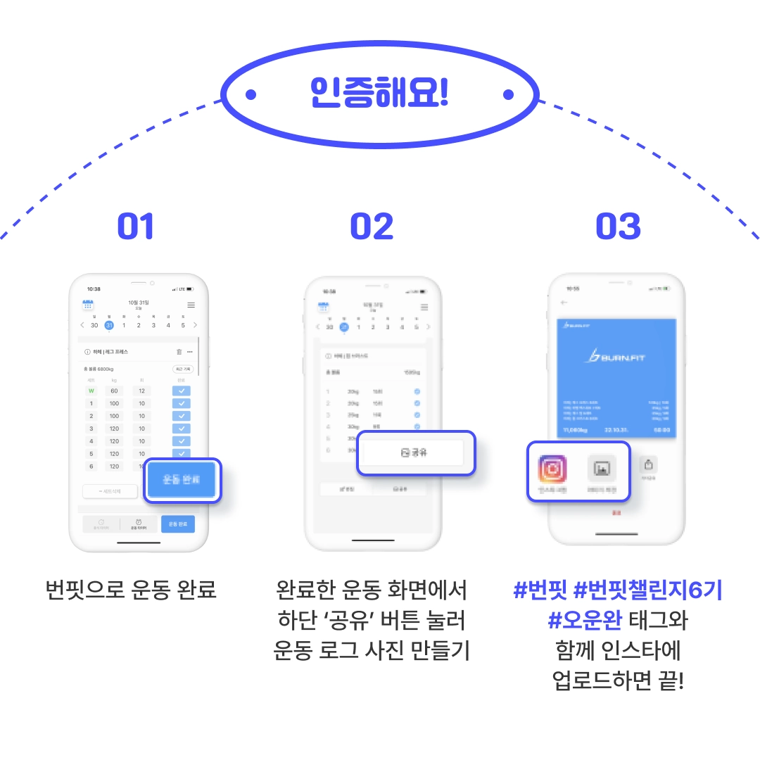 자신의 인스타그램에 #번핏 #번핏챌린지6기,#오운완 태그와 함께 업로드 하고 채팅방에서 매일 제공하는 링크에 답변하면 끝!!
