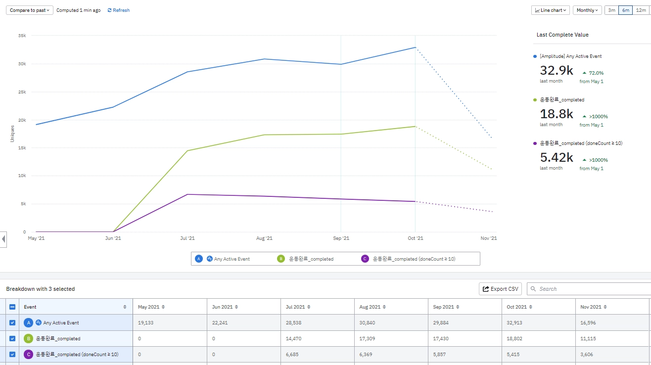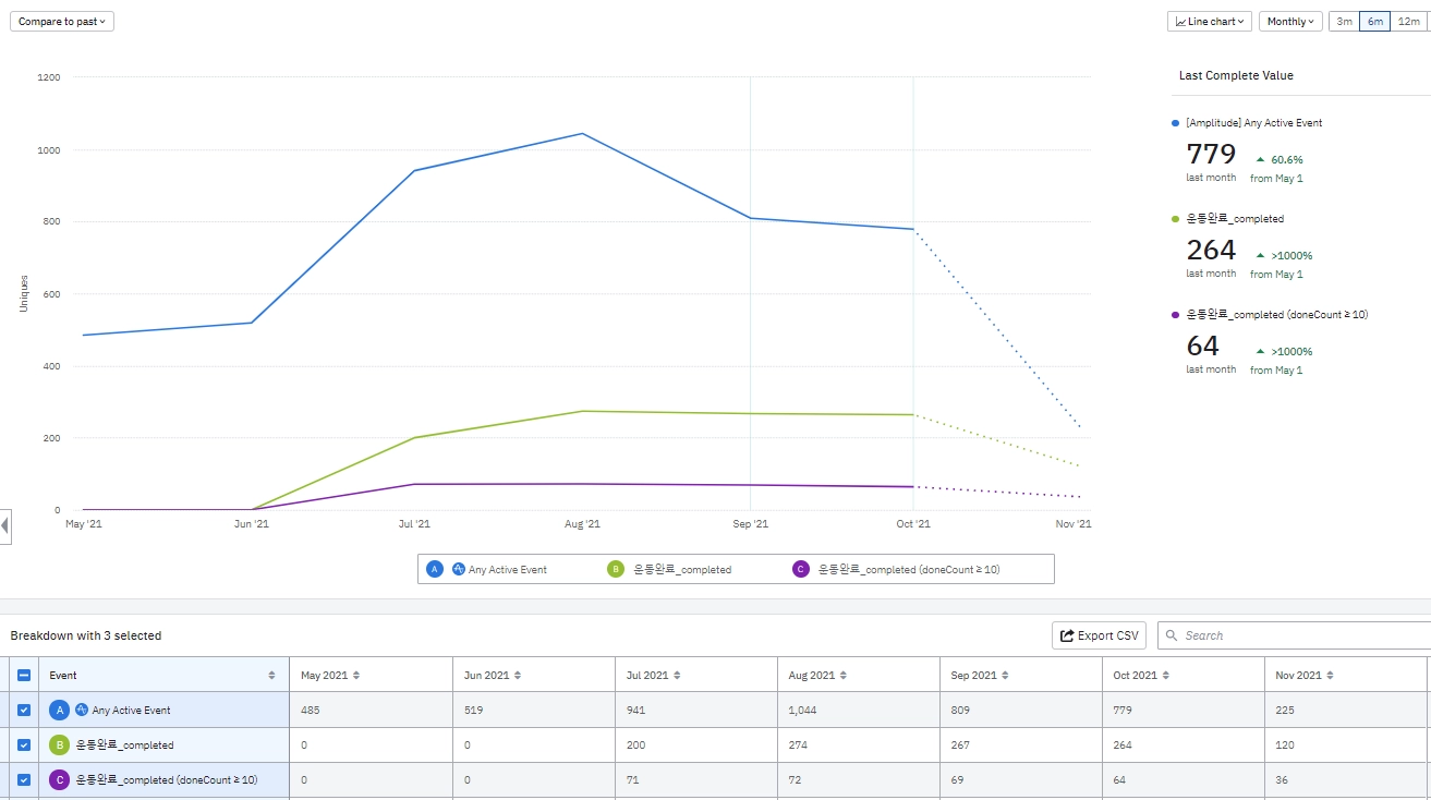 → 문제점: 10회이상 운동완료한 유저 수 감소