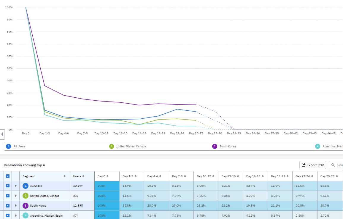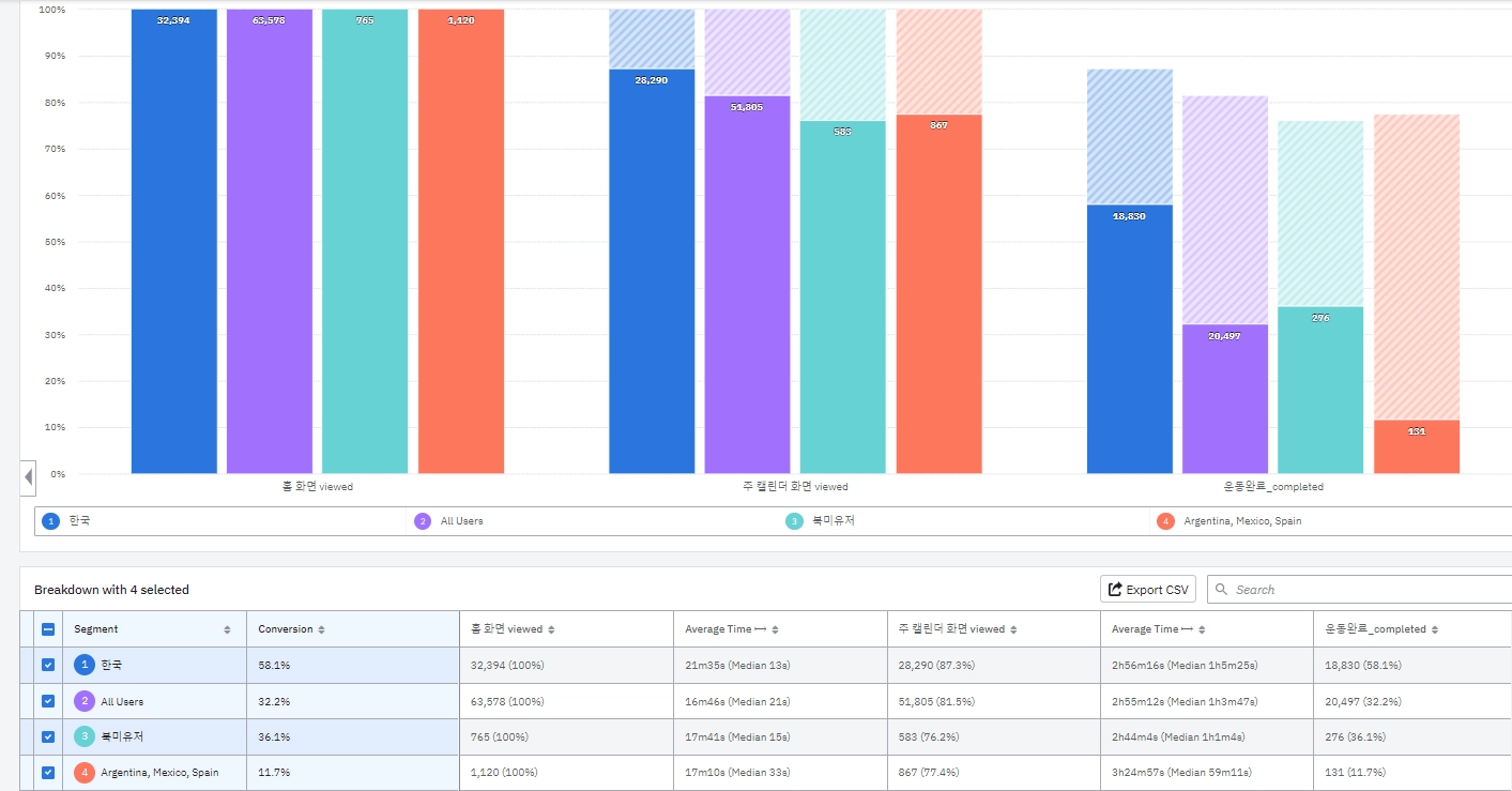 1) 운동완료 버튼 클릭까지 국내 유저와 북미 유저간 약 19% 차이 존재