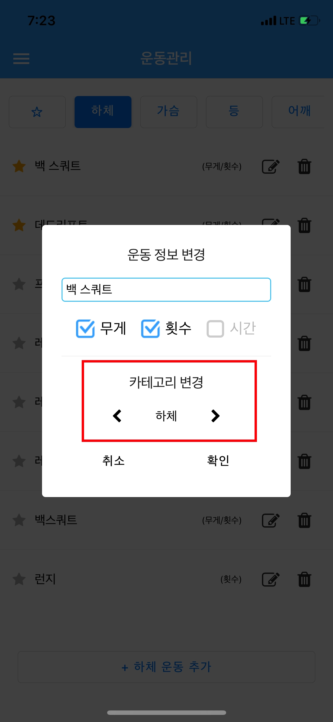 이제 운동 수정 단계에서, 부위(카테고리)와 운동 타입(무게, 횟수, 시간) 모두 변경 가능합니다.