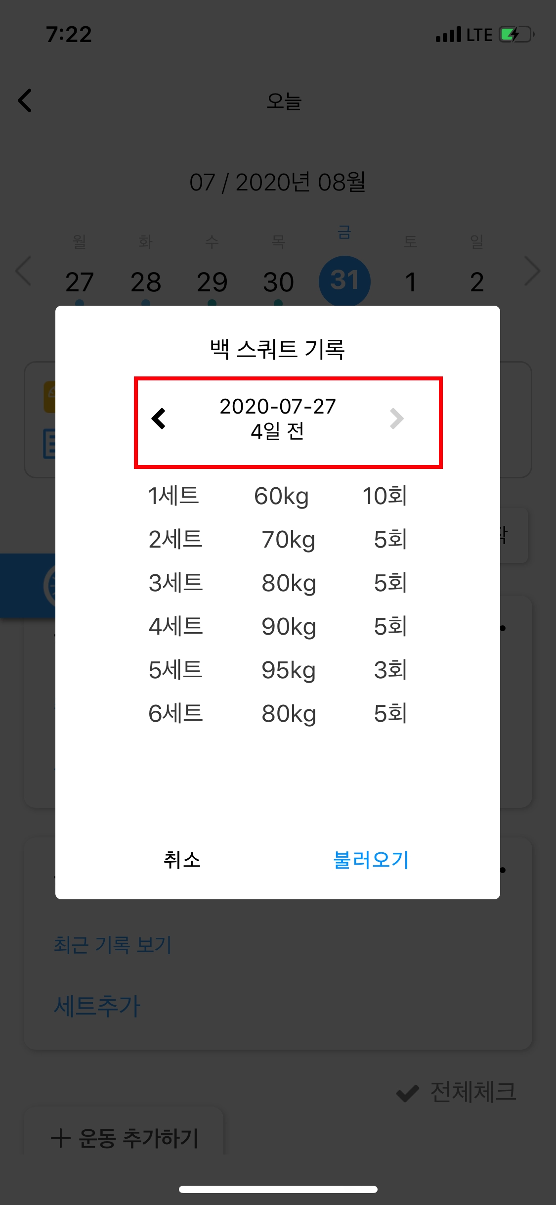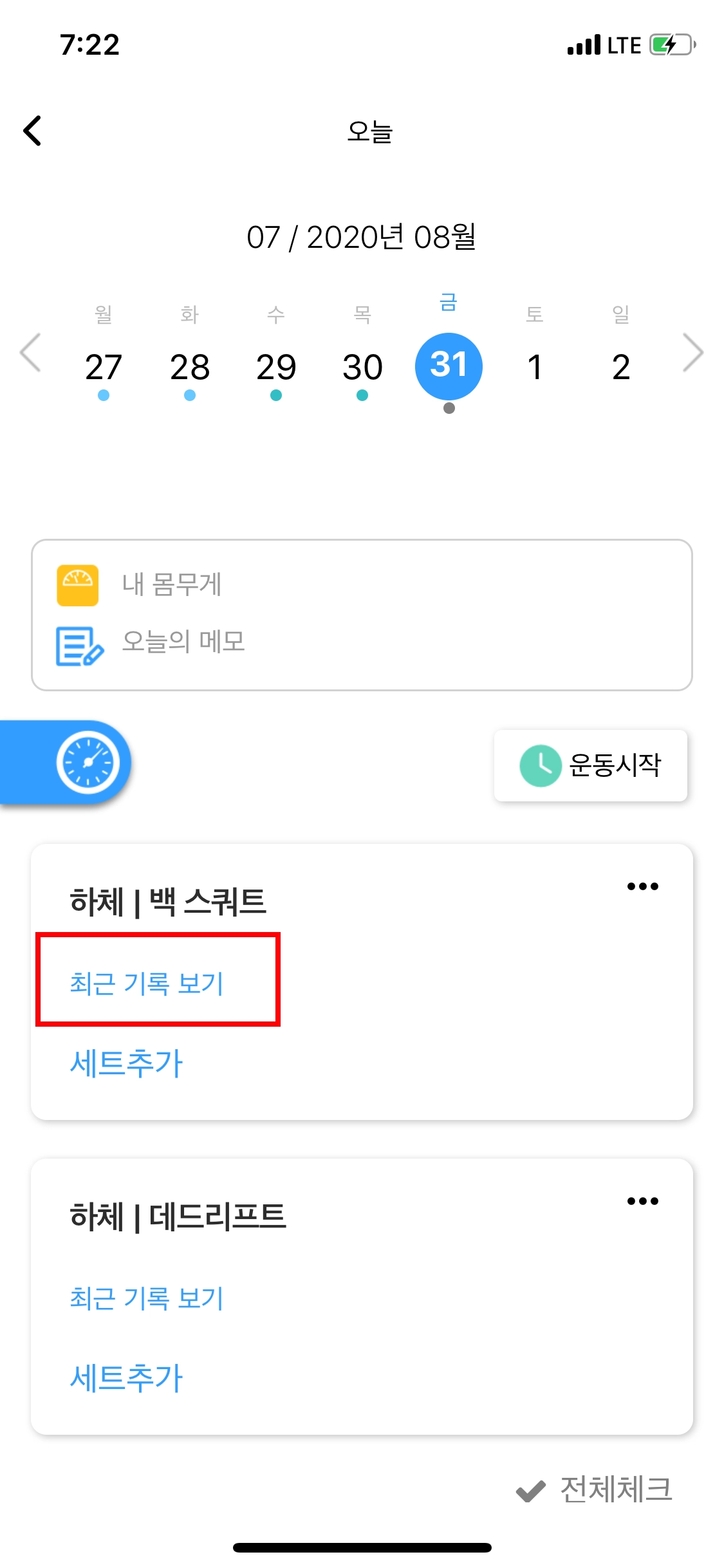 다음과 같이 내가 이 운동을 과거에 얼마나 했는지 파악할 수 있습니다. (스쿼트를 안한지 4일이나 되었군요..)