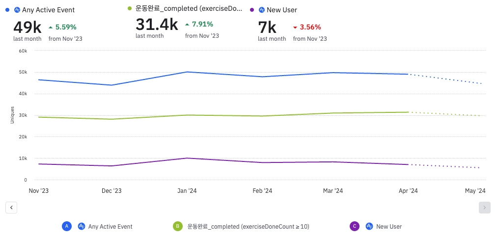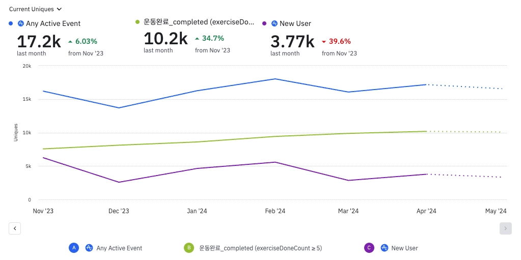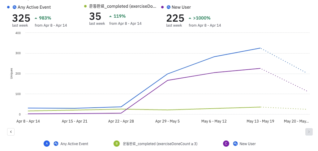 원데이 클래스를 통해 신규 유저 수를 증가시키는데는 실패했습니다. 클래스 진행 트레이닝 그룹과의 프로모션, 참여자 리뷰를 기반으로한 컨텐츠를 통해 신규 유저를 추가적으로 획득하고자 합니다.