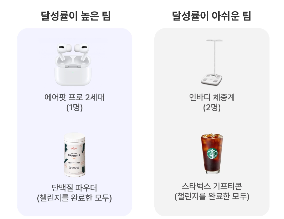 4주간 총 100% 성공한 분들을 대상으로 추첨하여 선물을 드립니다. 물론 팀마다 선물은 달라요!