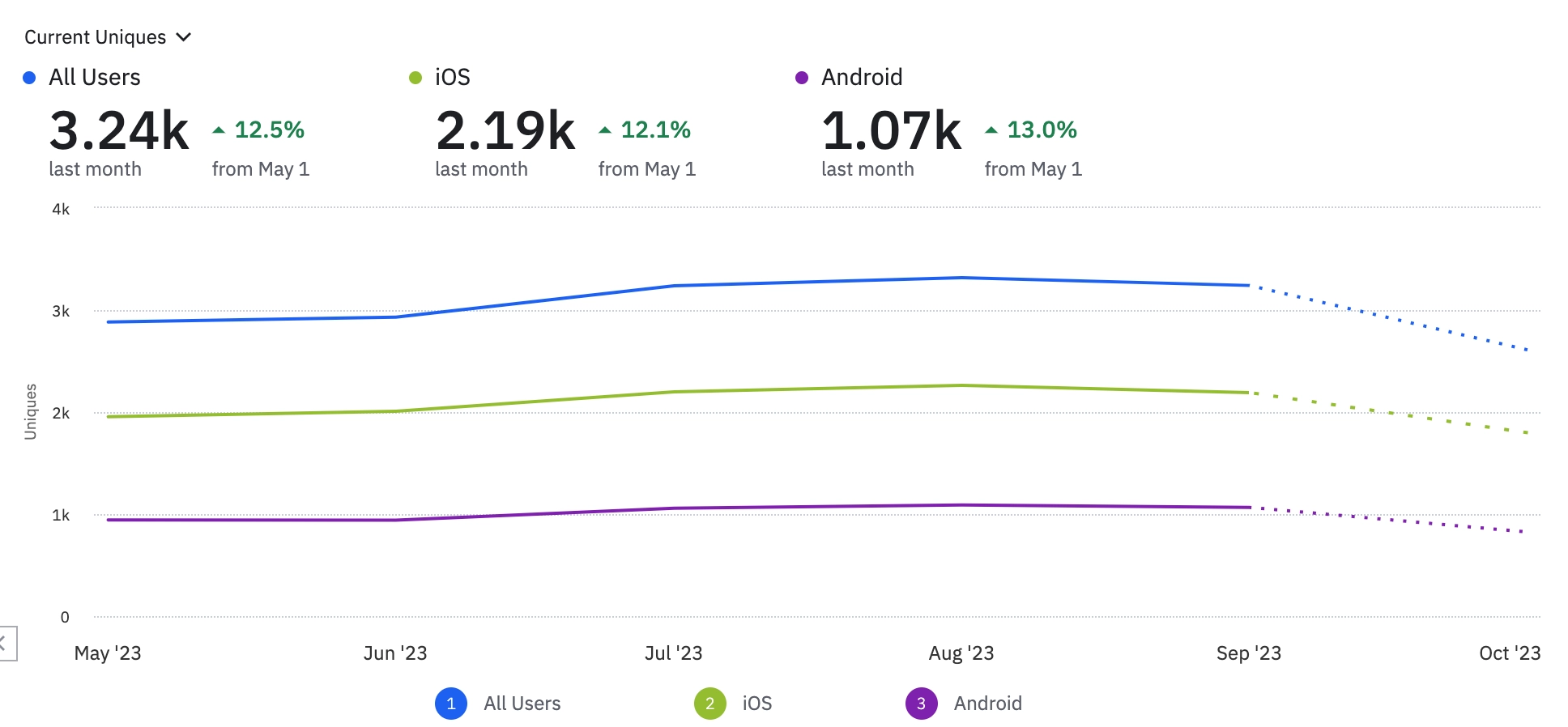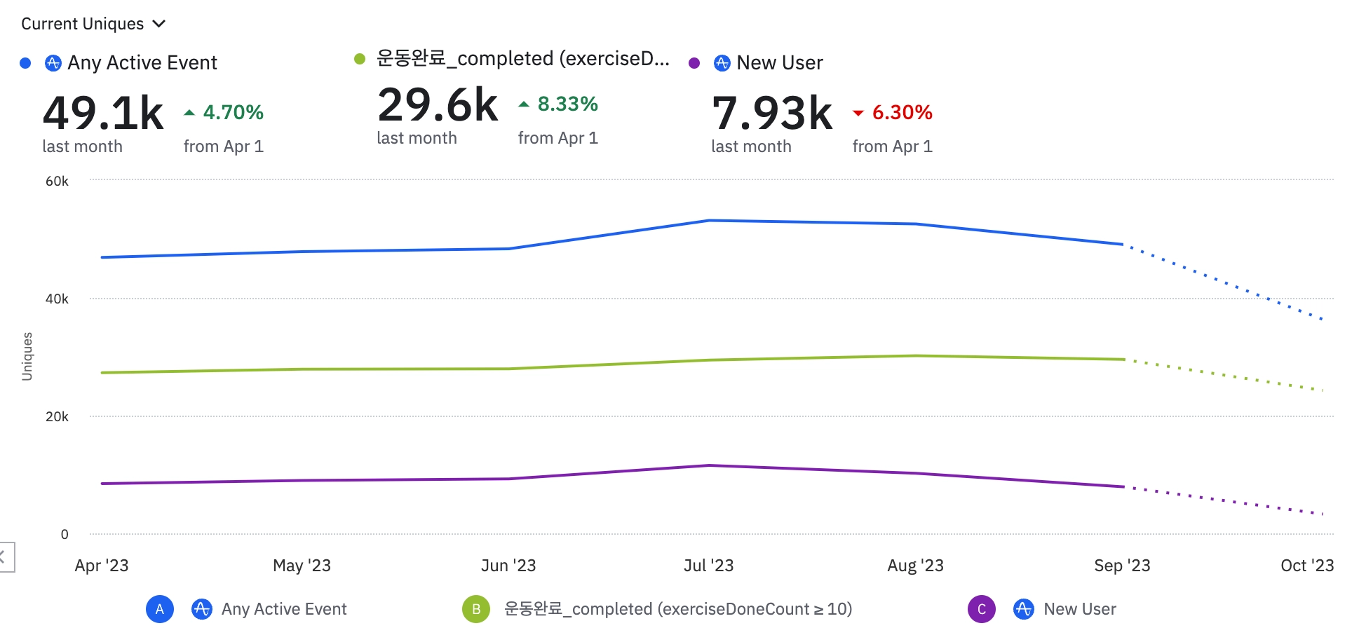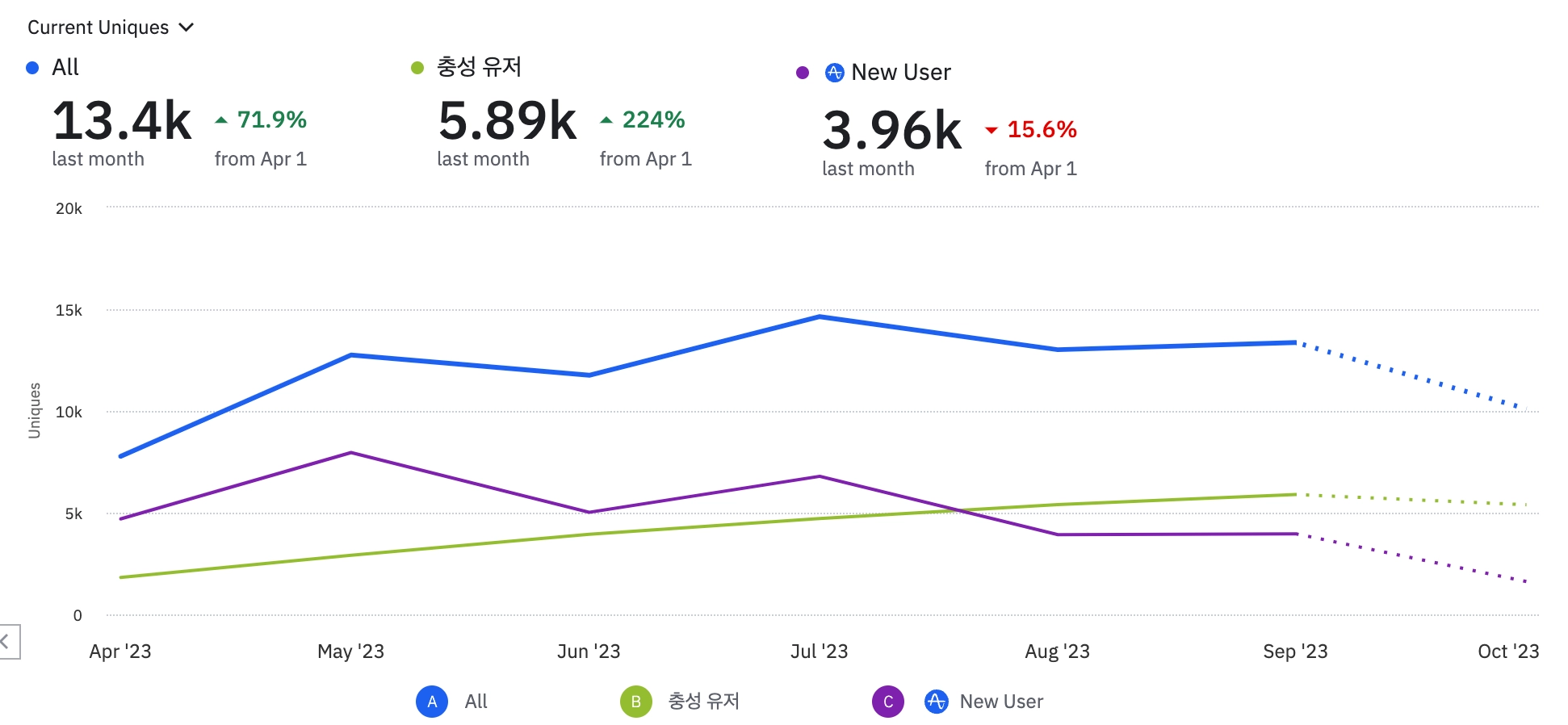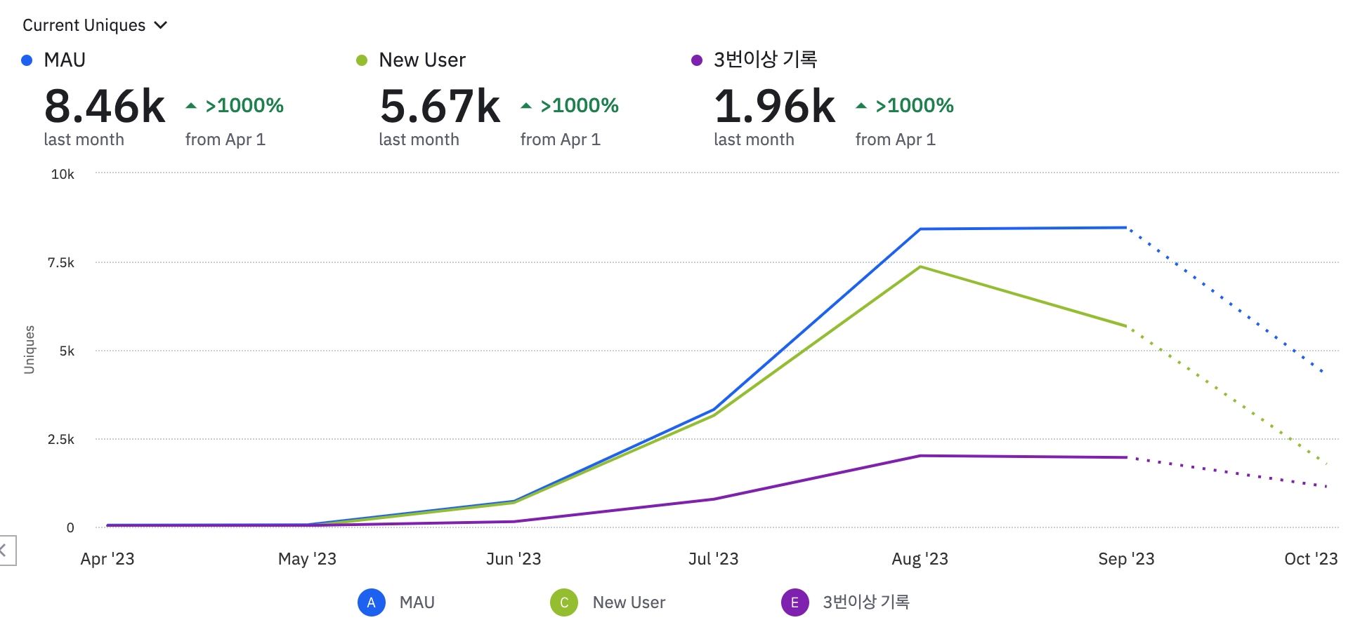 8월부터 SEO를 기반으로한 오가닉 마케팅으로 전환하면서 2달간 신규 유저 유입량이 월 4천명 정도로 소폭 감소하였습니다. 10월부터는 SEO를 기반으로 다시 인플루언서 기반 PR마케팅을 통해 신규 유저수를 증대시키고자 합니다.