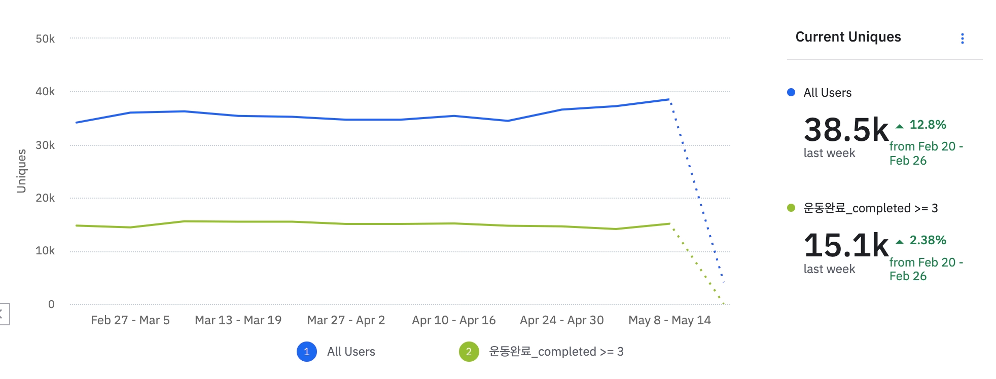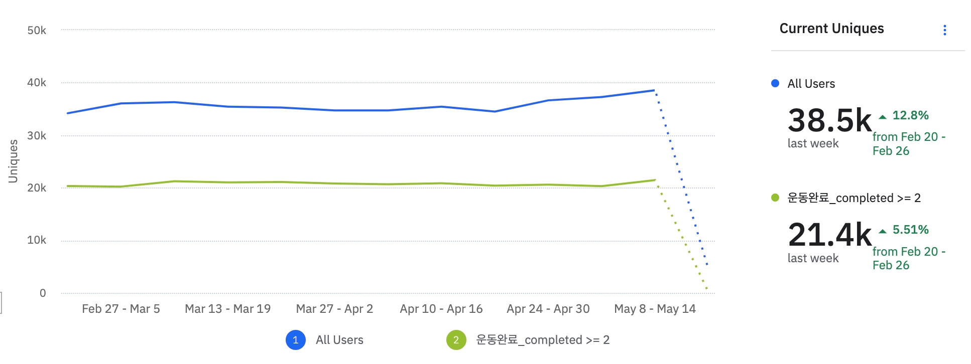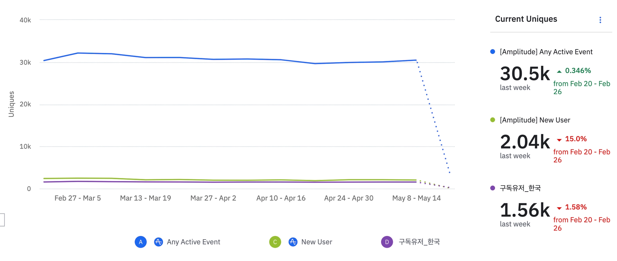 한국 - MAU 5.4만명 / 핵심유저 비율 43% / 연간구독 성장률 225% / Stickness 27% / 21일 리텐션 21.7%