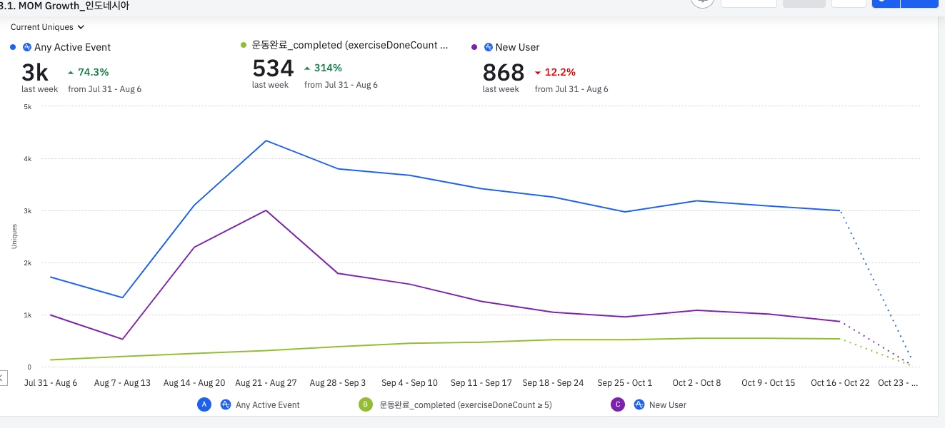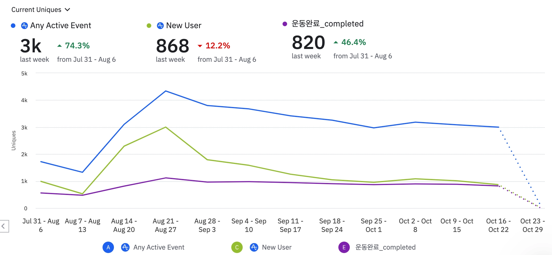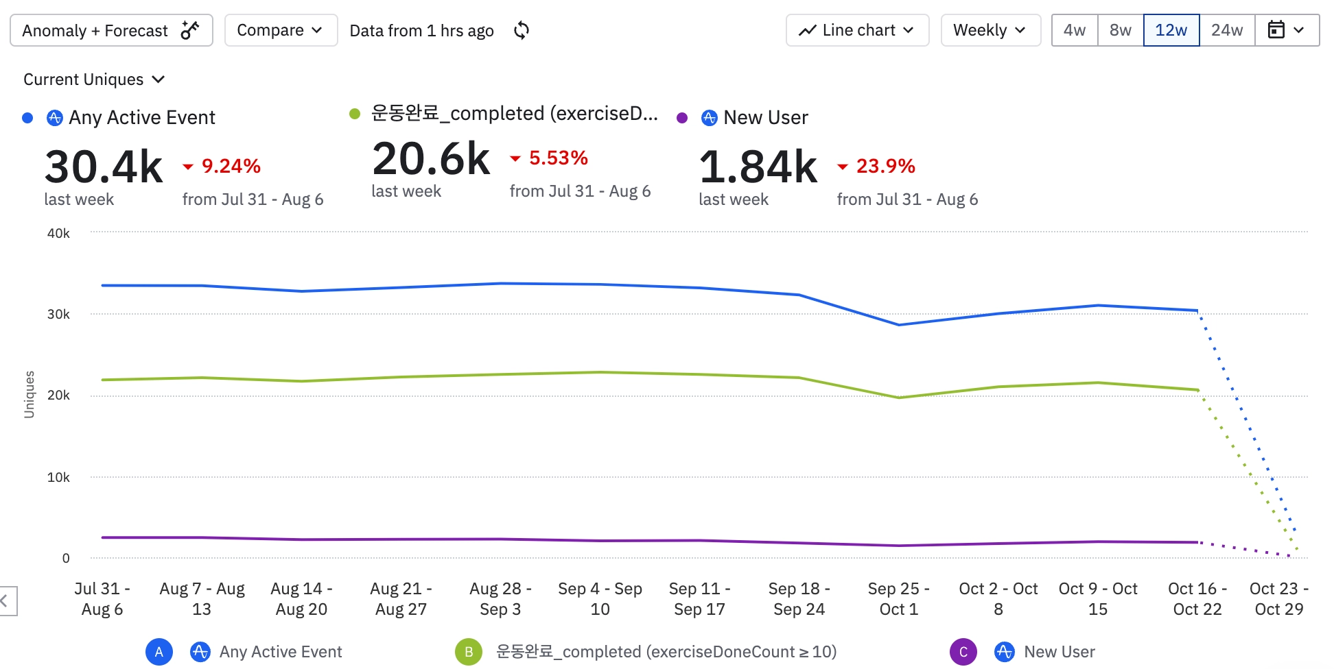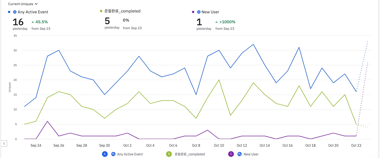 하루 150~200 사이로 신규 유저 유입은 되고 있으나 운동 완료(충성유저) 로 남는 유저의 비율의 증가는 느림.