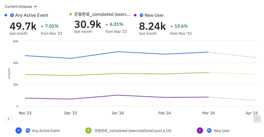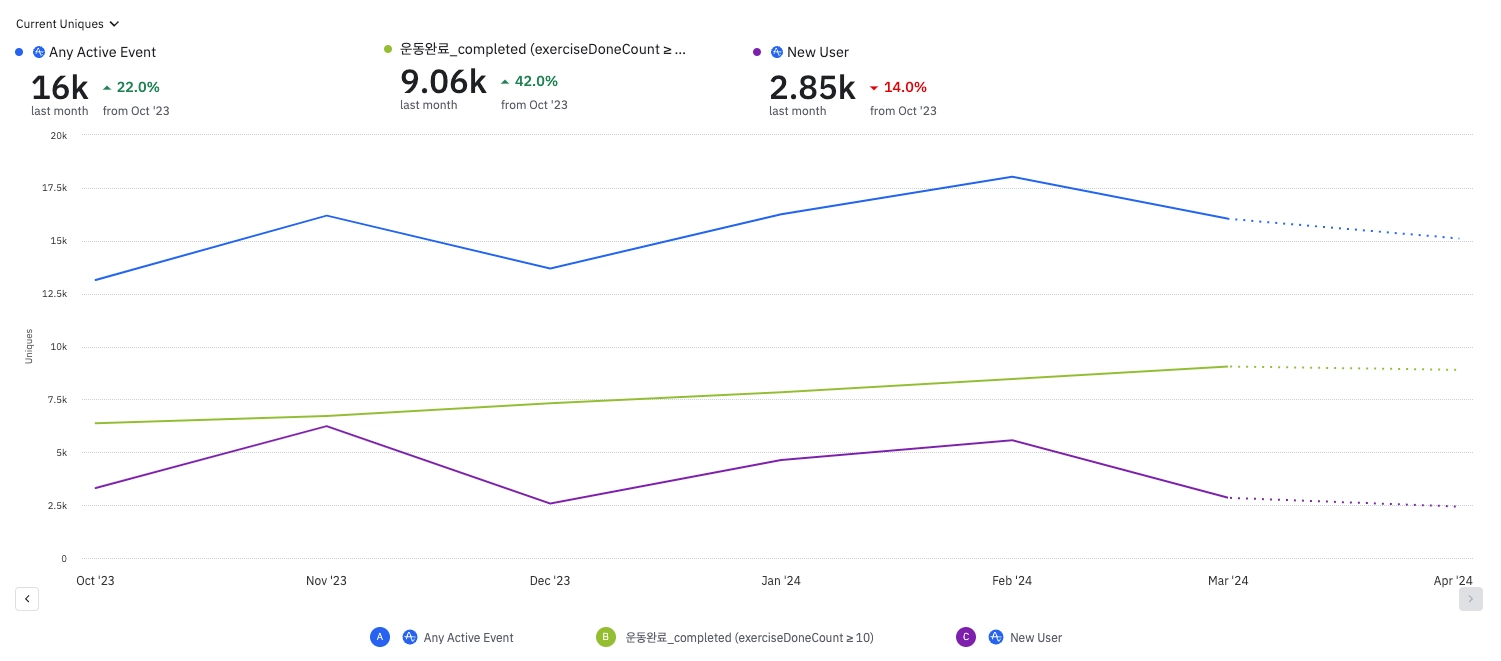 10번이상 기록하는 충성유저 숫자, 구독 유저 숫자는 지속적으로 증가하고 있습니다.
