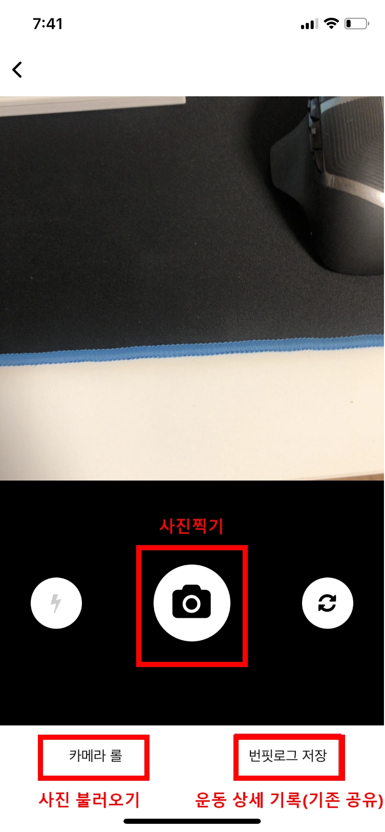 번핏로그를 제외한 두 기능은 사진을 찍거나 불러와 해당 사진에 내 운동 기록을 기입하는 새로운 방식입니다.