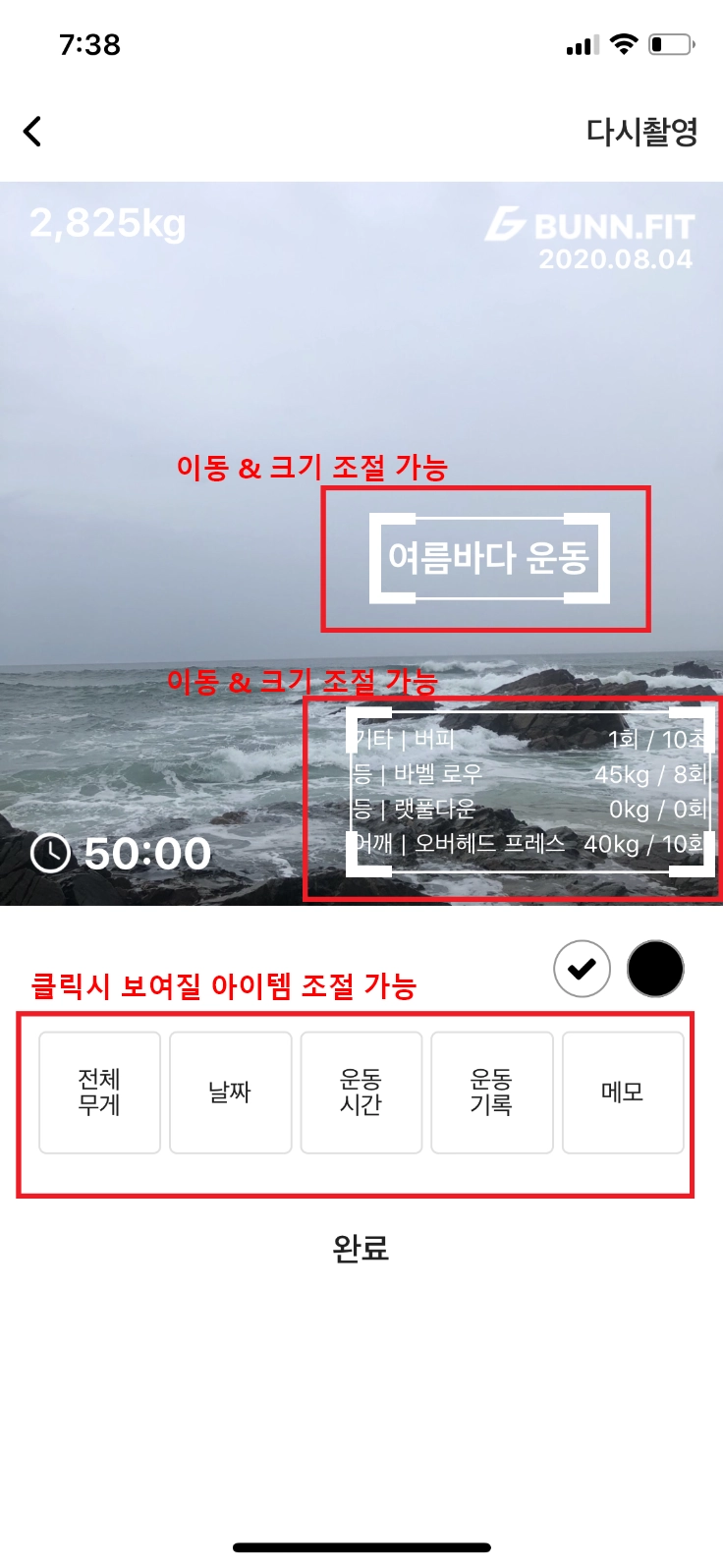 이제는 직접 사진을 찍고 해당 사진에 내 운동 기록을 기입하여 공유할 수 있는 기능도 추가 되었습니다.