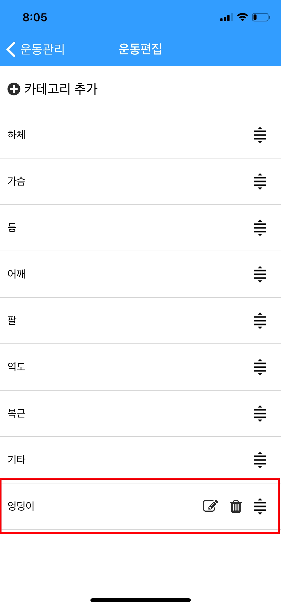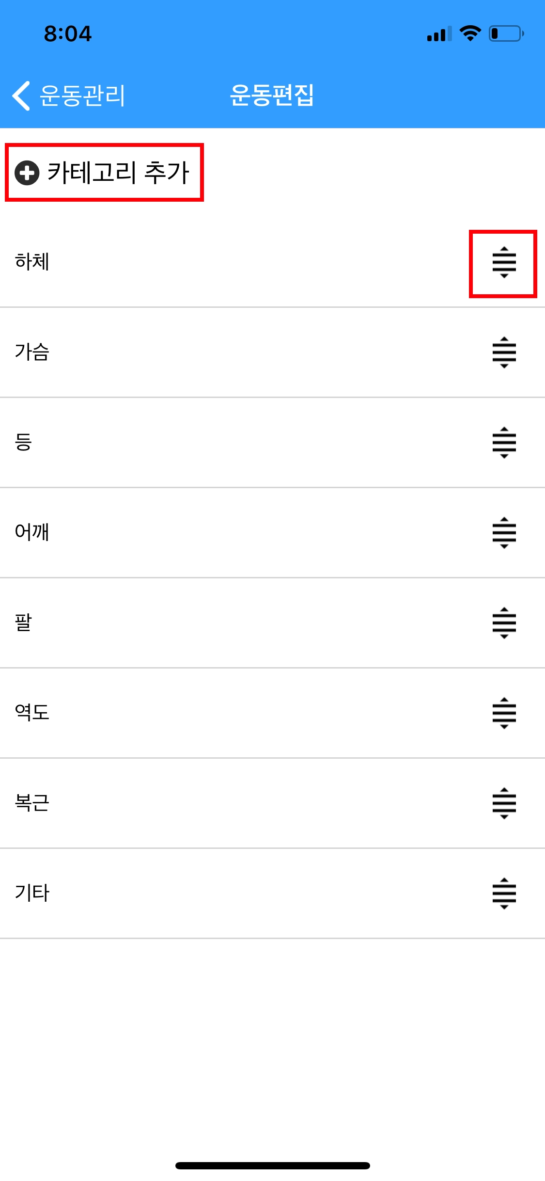운동 카테고리 추가와 카테고리의 순서 변경도 가능합니다.