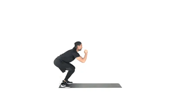 스쿼트 자세에서 올라오면 점프를 하는 동작입니다. 고강도의 유산소성을 가지고 있는 운동이죠!