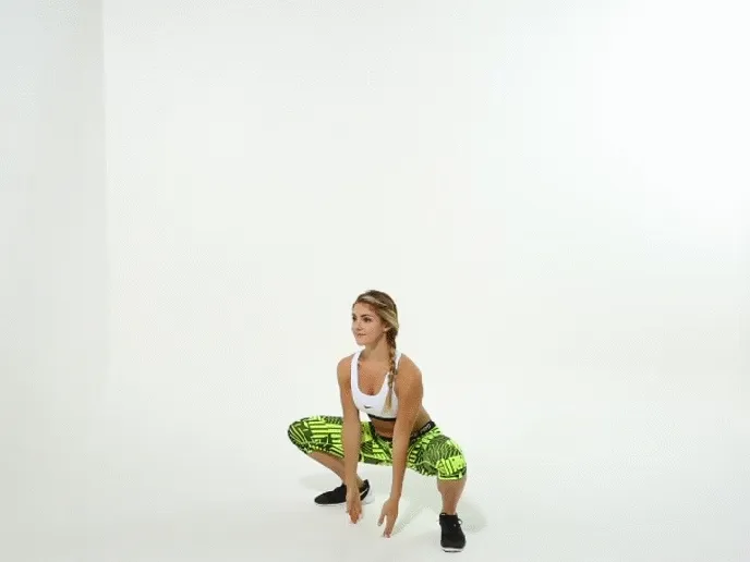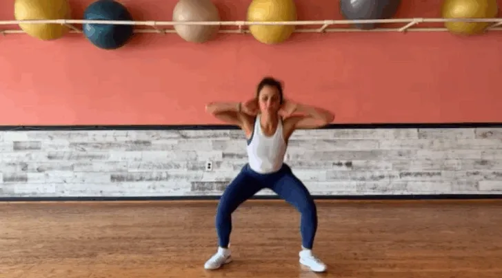 일반적인 스모 스쿼트와 같지만 손의 움직임을 통해 유산소성 움직임을 추가합니다.