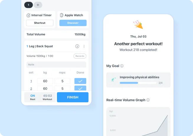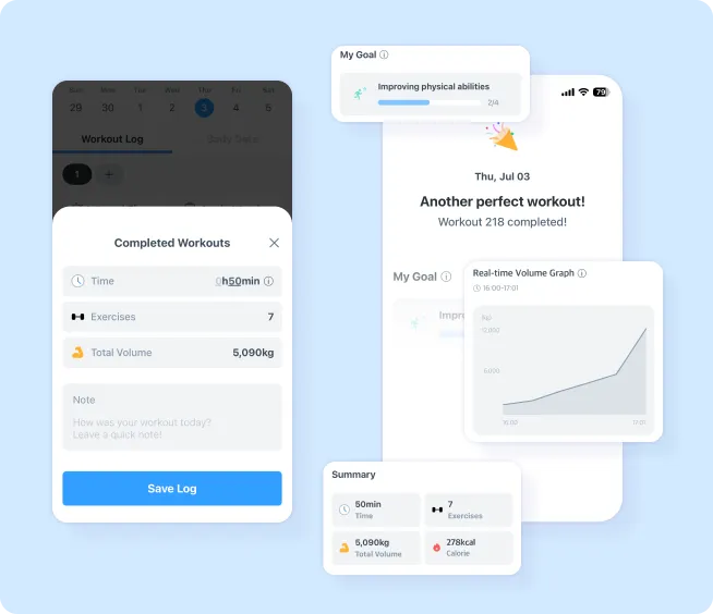 Step 2. Once you save your log, you'll see real-time changes in workout volume, calories burned, and the progress toward your weekly goal.