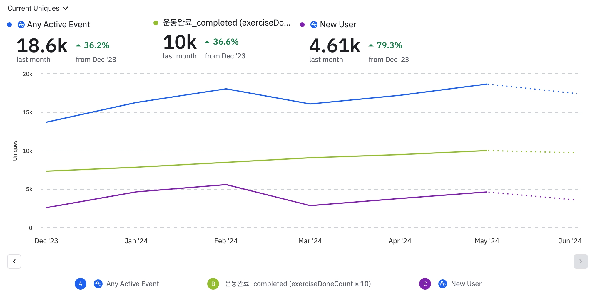 10번이상 기록하는 충성유저 숫자, 구독 유저 숫자가 지속적으로 증가하고 있습니다.