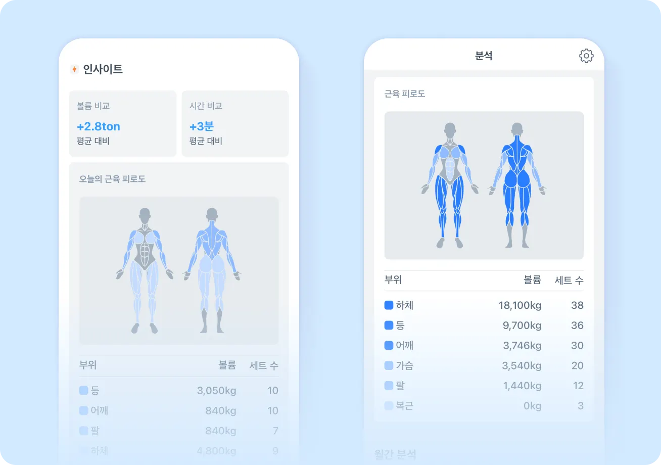 당일 근육 피로도는 운동 완료 페이지에서, 주간 근육 피로도는 앱 하단 분석 탭에서 더 상세하게 볼 수 있어요!